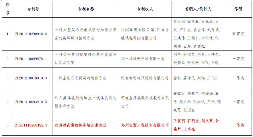 河南知識產權局發布通知公告:根據《河南省專利獎勵辦法》(豫政〔2017〕28號)、《河南省專利獎勵辦法實施細則》(豫知〔2017〕53號)有關規定,河南省專利獎評審委員會辦公室組織開展了第二屆河南省專利獎評選。經推薦審核、第三方評價、專家評審、實地考察、評審委員會審定等程序,共評選出特等獎1項、一等獎5項、二等獎18項、三等獎25項。