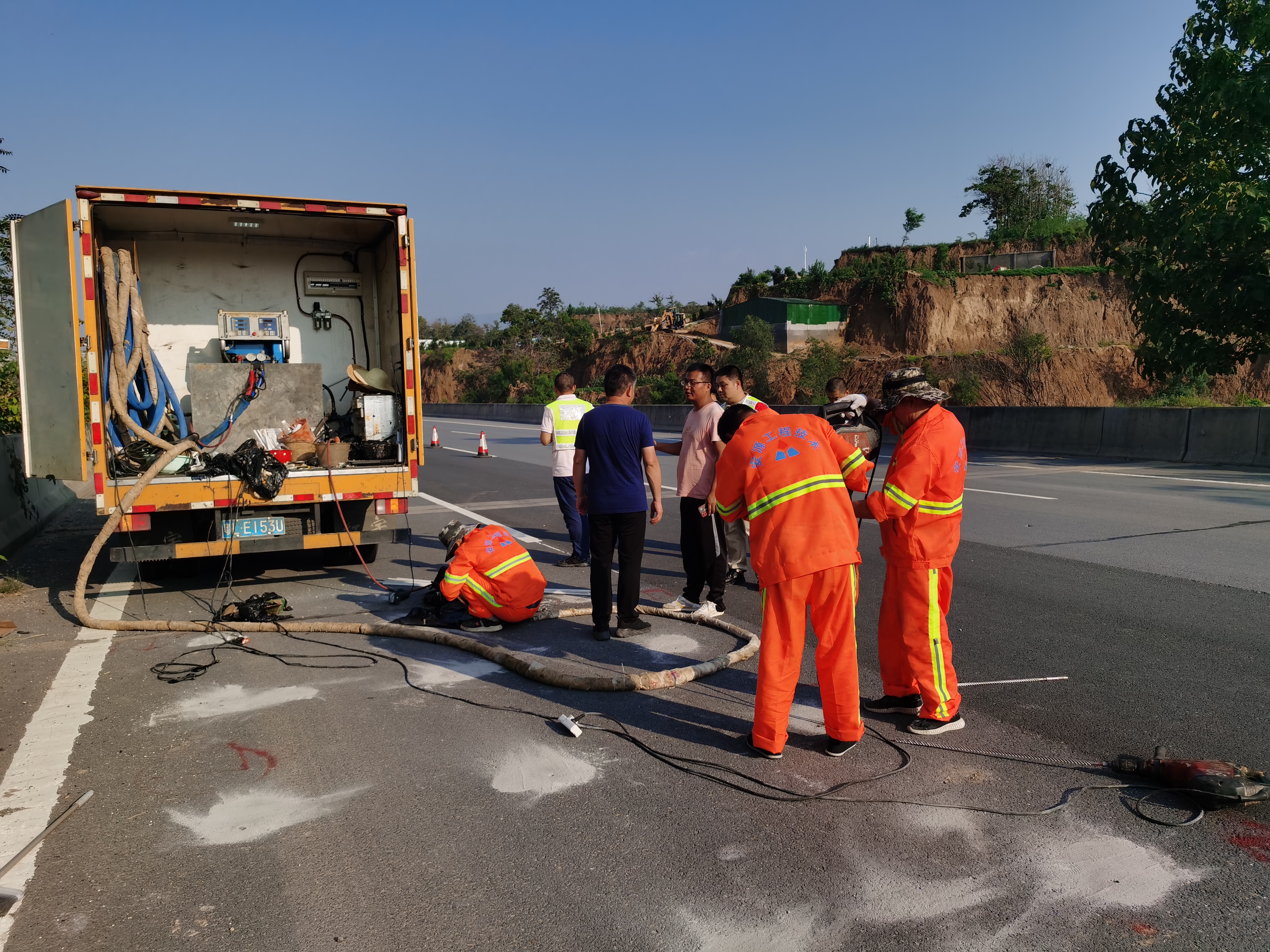 連霍高速鄭洛段連日暴雨導(dǎo)致路基積水成災(zāi),河南省公路工程局聯(lián)系我司請(qǐng)求支援。公司第一時(shí)間組織救援隊(duì)趕赴現(xiàn)場(chǎng)對(duì)路面進(jìn)行檢測(cè),對(duì)空洞部分使用高聚物進(jìn)行注漿填充加固,高效快速完成項(xiàng)目,減小對(duì)通行車輛的影響,保障高速路的安全運(yùn)行。